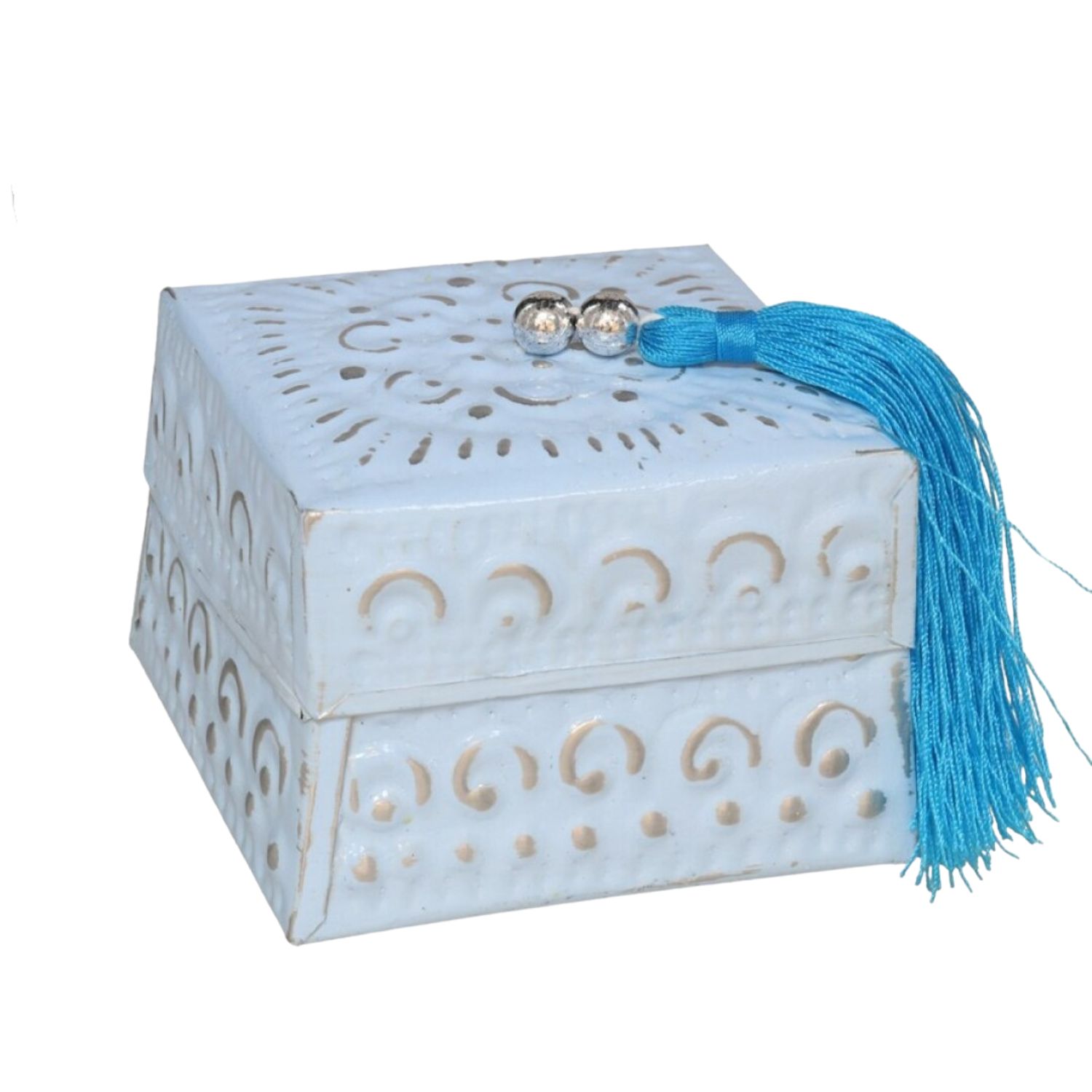 À la recherche d’un objet à la fois décoratif et fonctionnel ? Cette boîte carrée en métal (8x8x6 cm) est l’accessoire idéal pour sublimer votre intérieur tout en offrant un rangement raffiné. Son design travaillé, associé à des détails dorés vieillis sur un fond bleu délicat, lui confère un charme intemporel.